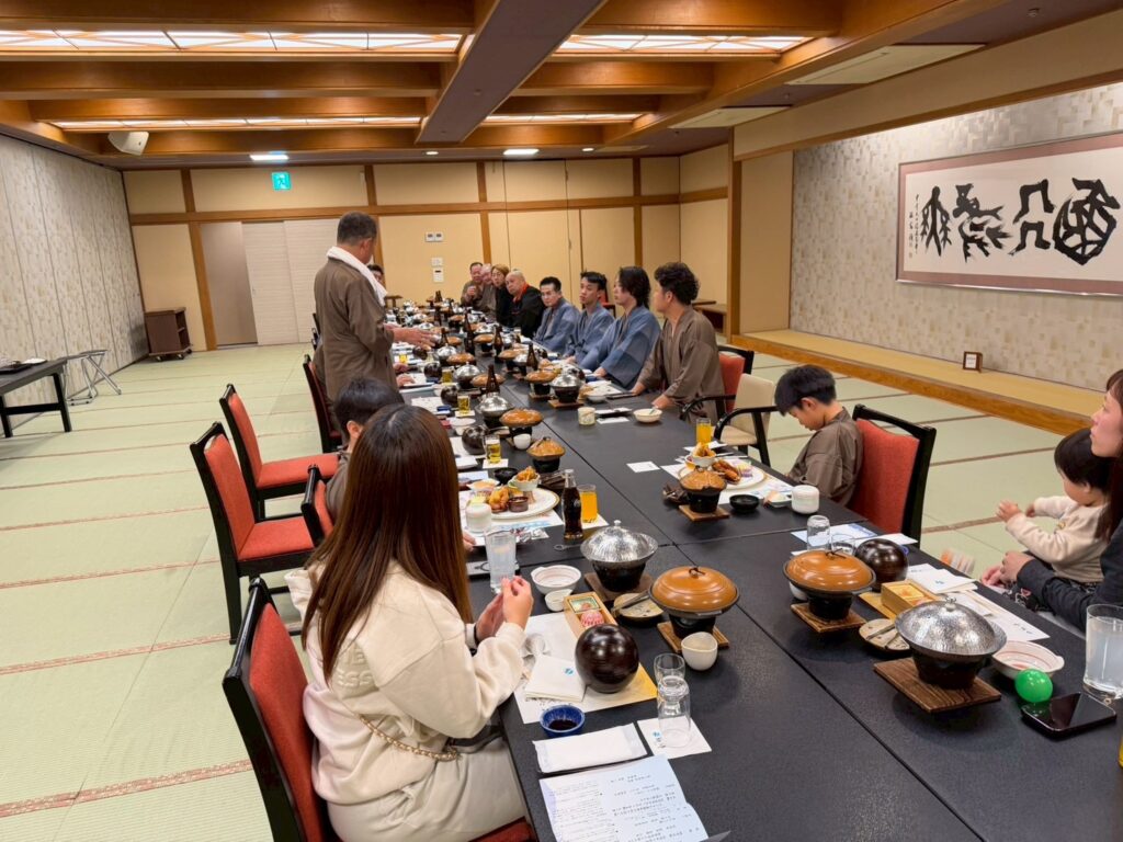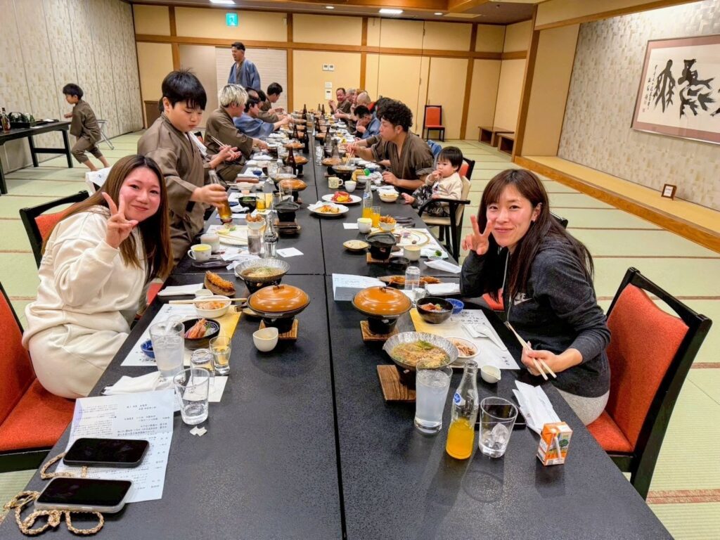 あるテーブルでは、社員同士が肩を並べて座り、昼間の思い出話や仕事の話など、様々な話題で盛り上がっていました。旅館での食事は、社員同士、そして家族との絆を深める大切な時間となりました。